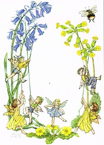 Kunstpostkarte Elfen und Frühlingsblumen von Molly Brett.