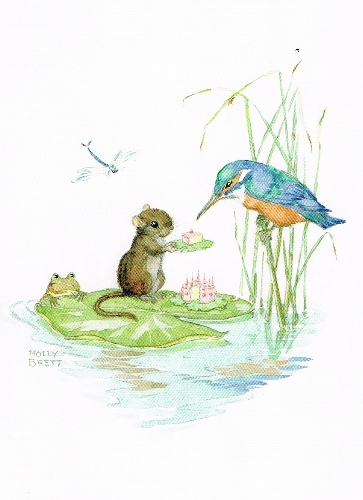 Kunstpostkarte Maus schenkt dem Eisvogel einen Geburtstagskuchen von Molly Brett.