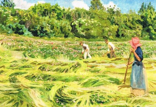 Kunstpostkarte Heuernte uf Südfünen (1902) von Peter Hansen (1868-1928).