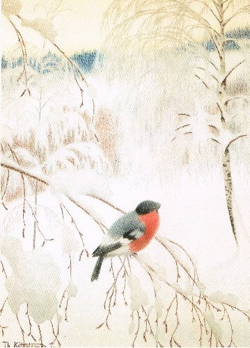 Kunstpostkarte Dompfaff auf vereistem Zweig von Theodor Severin Kittelsen.